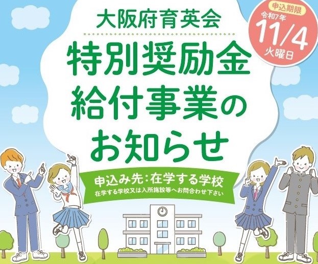 大阪府内に住所を有する者の保護する学生・生徒で、向学心に富みながら経済的理由により修学困難な者に、奨学金の貸付その他奨学上必要と認める事業等を行うことにより、教育の機会均等に寄与するとともに、次代の社会を担う有用な人材の育成に資することを目的とする。
