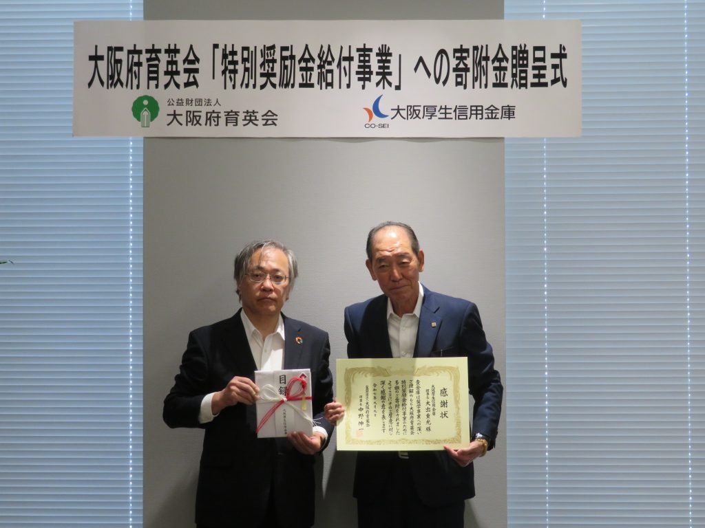今般、昨年に引き続き、大阪厚生信用金庫様より、本事業の趣旨にご賛同いただくとともに、多額のご寄附をいただき、同金庫様のご厚意に対し、当会中野理事長より感謝状を贈呈いたしました。